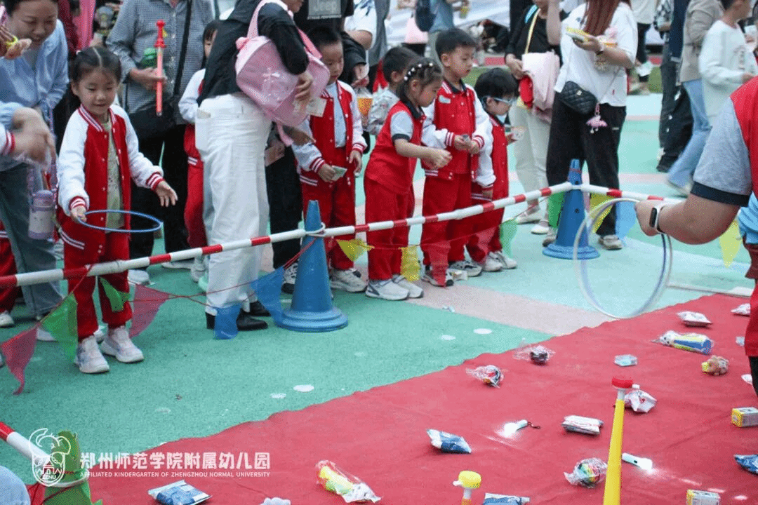 最受欢迎的当属“玉兔圈圈乐”,沙池前排起的队伍从活动开始就没断过。孩子们小手紧紧捏着彩色套圈,眼睛死死盯着摊位上的玩偶、卡通贴纸和零食。有的孩子第一次没套中,小嘴微微撅起,负责摊位的老师便微笑着鼓励道:“再试一次,你一定可以!”当圈终于稳稳套中目标时,孩子会蹦着扑进家长怀里,举着礼物炫耀“我赢啦”。直到活动接近尾声,还有孩子拉着家长的手不肯走,念叨着“再玩一次就好”,这份执着里满是对游戏的喜爱。